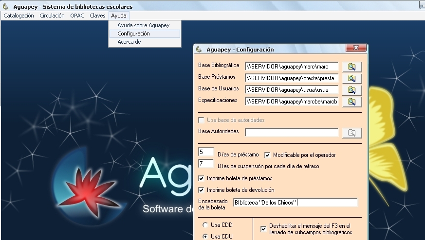 Muy buen aporte con las capturas, en realidad el concepto básico para entender todo esto es la parte de Configuración. No está de más insistir en ese concepto: lo fundamental de nuestras bases de datos se almacena en los archivos que determinamos desde configuración. Todos los registros de la base bibliográfica van, por defecto, a c:\aguapey\marc\marc.mst, los de la base de usuarios a C:\aguapey\usua\usua.mst y los de la base de préstamos a C:\aguapey\presta\presta.mst. Esos tres archivos: marc.mst, usua.mst y presta.mst son fundamentales para resguardar nuestras bases, esos son los que se guardan al hacer un backup y los que nos permiten hacer backups manuales (así se explica en el tutorial Arreglos versión 1.3.3). Por eso, todas las configuraciones en una instalación en red deben remitir a las mismas bases. De todas formas, por experiencias que nos comentaron, es recomendable que la circulación de documentos se lleve a cabo sólo en la computadora Servidor.